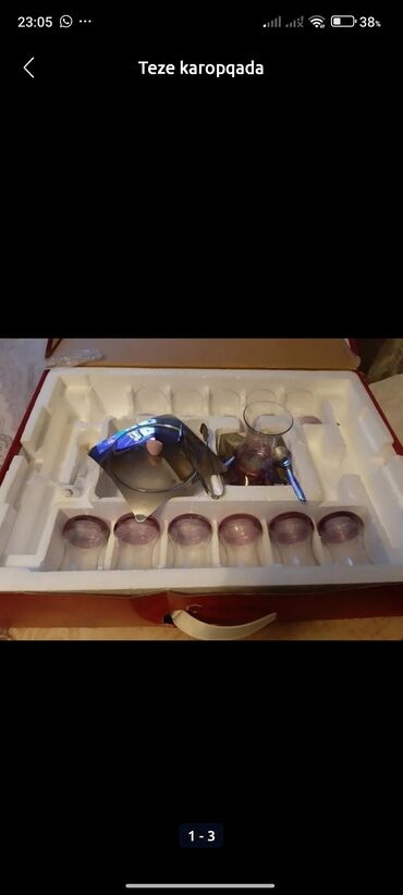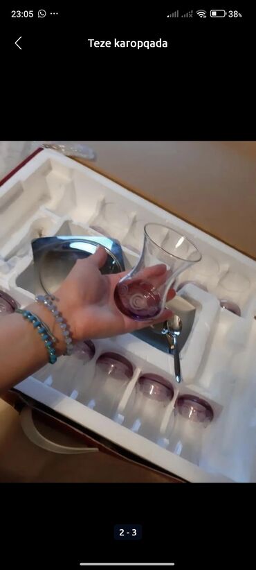 Şüşə çay stəkanları dəsti yeni - Say: 11 ədəd - Material: şəffaf şüşə - Dizayn: armudu forma, kənarında qızılı haşiyə, gövdədə qızılı zolaqlar - Ölçü: kiçik armudu çay stəkanı ölçüsündə (klassik ...
