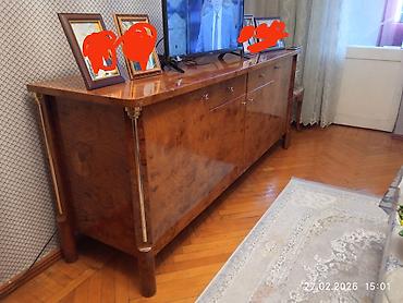 - Enli bufet/komod: üstü cilalı taxta səth, dörd qapılı və orta hissədə iki çekmece; kənarlarında eyni dekorativ sütun detalları.