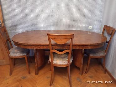 - Oval formalı geniş yemək masası (taxta üstlü, cilalı səth, dekorativ kənar perimetri; 6 stula uyğun ölçüdə). Şəkillərdə 3 ədəd taxta stul yumşaq oturacaqla görünür.
