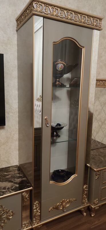 Klassik üslubda qonaq otağı mebel dəsti Tərkibi: - Böyük güzgülü konsol/komod – mərmər görünümlü üst səth, 4 qapılı geniş saxlama bölməsi, dekorativ relyeflər və qızılı bəzəklər. Üstündə böyük ölç...