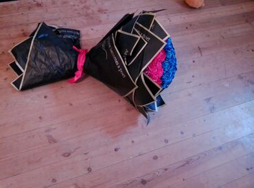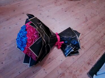 - Sarğı: qara-qızılı kənarlı buket kağızı, qırmızı lentlə bağlanıb. Kağız üzərində ingiliscə yazılar var.