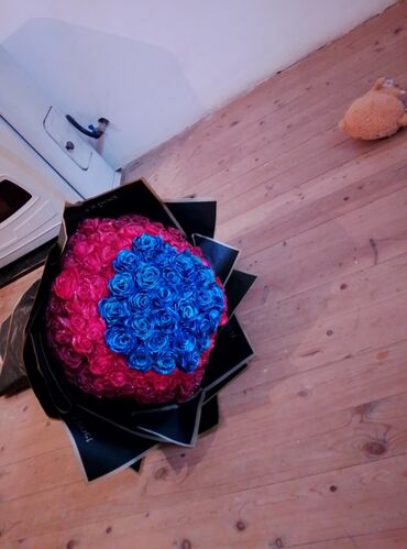 - Dizayn: dairəvi kompozisiya, mərkəzdə parlaq mavi qızılgüllərdən “ürək” formalı hissə, ətrafı çəhrayı qızılgüllərlə tam örtülüb.