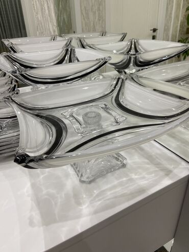 Mətbəx və süfrə dəsti – müxtəlif qrafin və stəkanlar, desert qabları və çay stəkanları - Paşabahçe armudu çay stəkanları: klassik forma, şəffaf şüşə. Qutu ilə. - Şüşə şampan/şərab qədəhləri: 6 ədə...