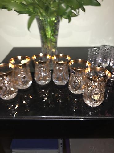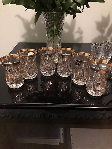 - 6 ədəd kəpəkli naxışlı şüşə stəkan – üst kənarı qızılı detallı, klassik armudu formaya yaxın, dərin oyma bəzəklərlə. Şəffaf şüşə, qızılı haşiyə ilə zərif kontrast yaradır; çay və ya soyuq içkilər üçün uyğundur.