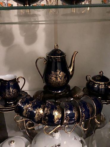 - Qaranlıq lacivərt rəngli, qızılı ornamentlərlə işlənmiş porselen çay/qəhvə servisi – çaydan, süd qabı, şəkərqabı və saplı fincanlardan ibarət. Fincanların hamısı eyni naxışda, qızılı kənarlıdır; vitrin və süfrə təqdimatı üçün dekorativ və şık görünüş verir.
