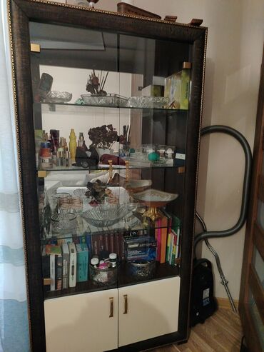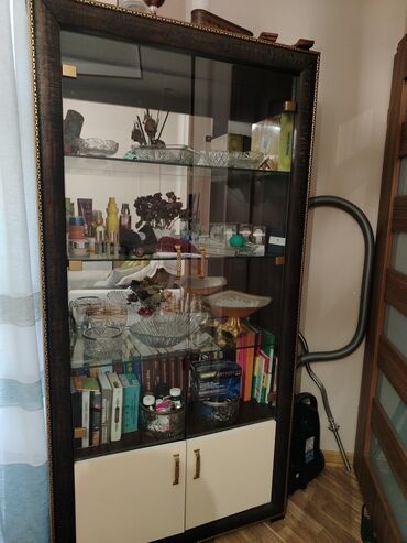 Şüşə vitrinli bufet/dolap - Material: parlaq krem rəngli korpus, ön hissədə şüşə vitrin, içəridə güzgülü arxa panel və şüşə rəflər - Üst hissə: iki mərtəbəli şüşə vitrin; şüşə qapılar, içəridə işı...