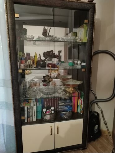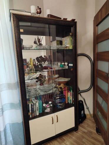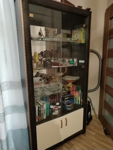 Şüşəli vitrinli bufet-dolab - Material: ağac karkas, ön hissədə ikiqat şüşə qapılar - Üst hissə: şüşəli vitrin bölməsi, içəridə rəflər – qab-qacaq, suvenir və kitabların nümayişi üçün uyğundur - O...