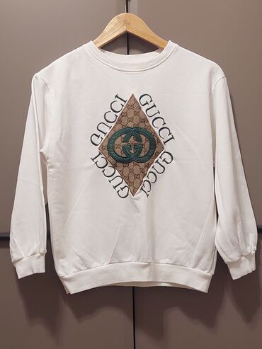 1) Ağ sweatshirt – ön hissədə iri romb şəklində “GUCCI” yazıları ilə dairəvi yaşıl emblem detalı. Romb daxilində klassik monoqram naxışlı parçadan aplikasiya. Yuxa dairəli yaxa, rezinli ətək və qolluq, rahat kəsim.
