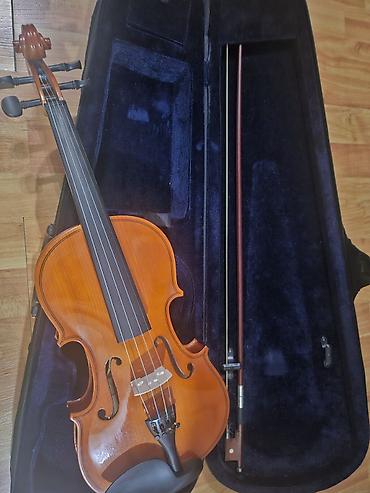 - Korpus: klassik 4/4 ölçülü skripka, parlaq laklı taxta gövdə, qara gripeboard və qulpalar