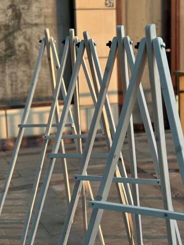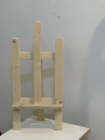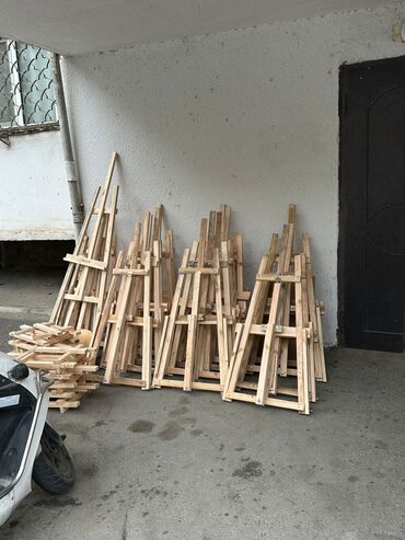 Şəkillərdə çoxsaylı ədəd mövcuddur: döşəmə ölçülü və masaüstü ölçülü taxta molbertlər.