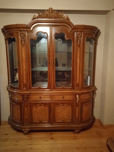 Klassik üslubda iri vitrinali bufet - Material: təbii ağacdan (oyma dekorlu), rəngi qoz tonlarında - Üst hissə: üç şüşəli vitrin bölməsi, hər bölmədə şüşə rəflər; yan tərəflərdə də şüşəli vitrində...