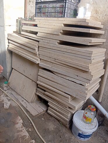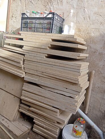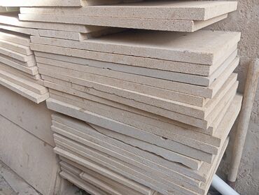Təbii daş plitələr – müxtəlif ölçülü, qalınlığı təxminən 2–3 sm aralığında kəsilmiş. Düz kənarlı, hamar səthli, kərpic-rəngli/bej tonlarda.