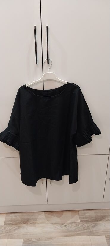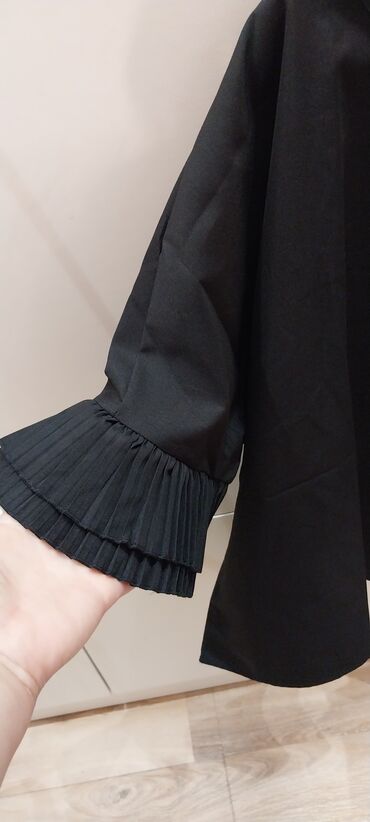 Qadın köynəyi – qara rəngdə, klassik yaxalıqlı. Üst hissədə (sinə və çiyinlərdə) incə krujeva/parça fakturası ilə dekor, eyni tərzdə geniş manjetlərdə krujeva detalları. Uzun qol, rahat kəsim, arxa...