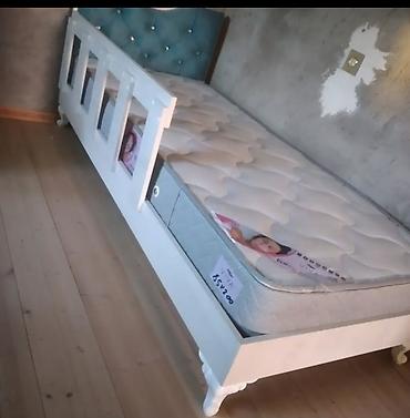 - Zərif dizaynlı tək çarpayı: ağ rəng korpusu, oyma dekorlu başlıq. Başlıqların variantları: bənövşəyi və mavi tonlu, düyməli (kapitone) yumşaq parça örtüklü.