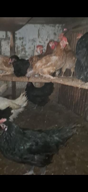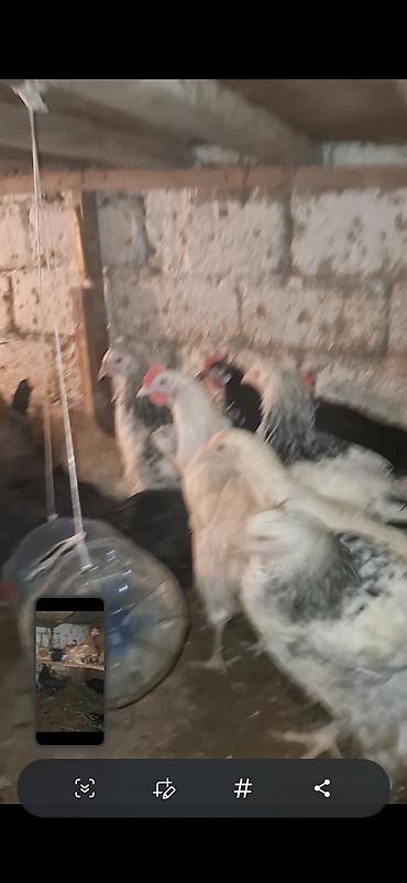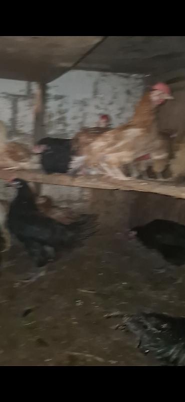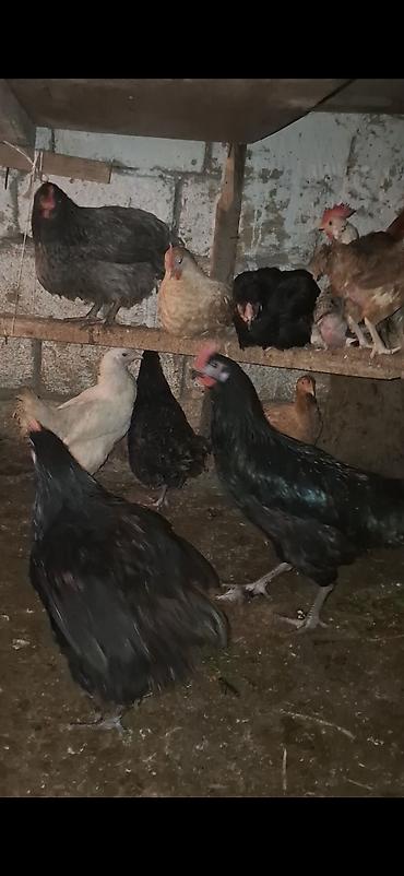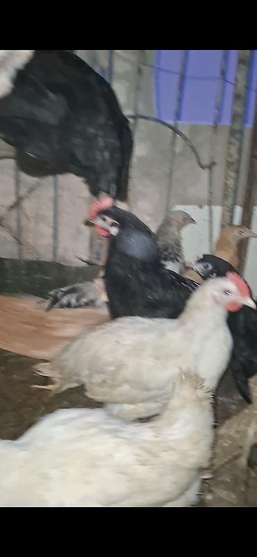 - Müxtəlif rəng və cinslərdən olan toyuqlar (qara, ağ və qəhvəyi rəngdə).
