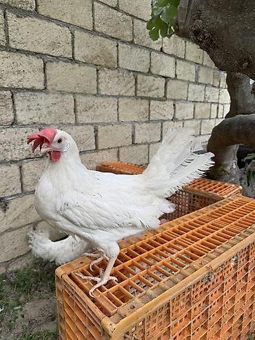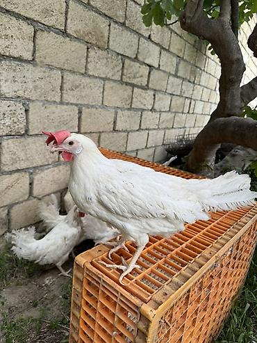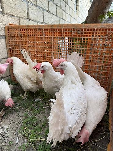 - Fotoşəkillərdə: bir neçə baş ağ toyuq, narıncı plastik qablarda və həyət şəraitində