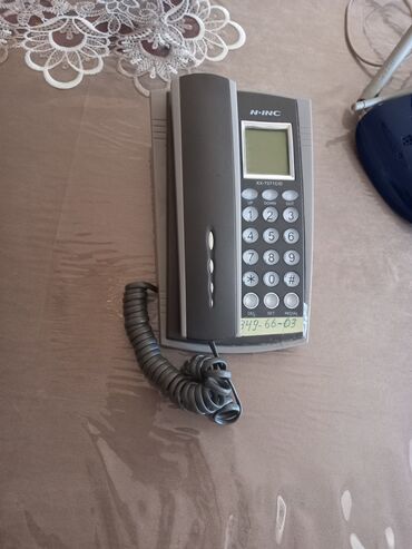 - Telefon: LCD ekran, rəqəmsal klaviatura (0–9, *, #), “UP/DOWN” naviqasiya düymələri, “DEL”, “SET”, “REDIAL” funksiyaları. Qulaqlıq-baza arasında spiral kabelli klassik masa telefonu.