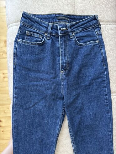 Trendyol qadın cins şalvar - Brend: Trendyol - Ölçü: 34 (etiketdə göstərilib) - Model: yüksək belli, düz/konik kəsim - Rəng: mavi, yuyulmuş (stonewash) effektli - Detallar: ön hissədə dizdə cırıq ...