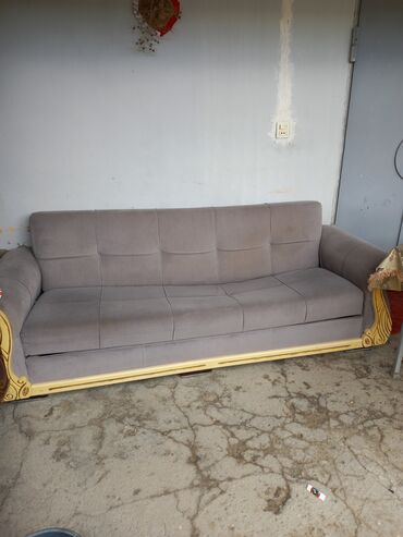 - Divan: 3‑yerlik, boz rəngli yumşaq üzlük. Oturacaq və arxa hissədə toxuma tikiş xətləri. Yanlarda ağac naxışlı dekorativ sürahilər, ön alt hissədə açıq ağac tonlu baza. Geniş oturma sahəsi və sakit rəng palitrası ilə qonaq otağına uyğun.