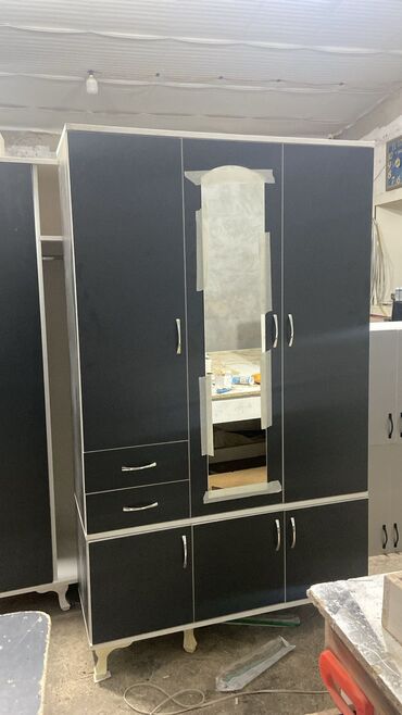Üç qapılı geyim dolabı - Material: ağac teksturalı laminat - Ön hissə: iki tamhündür güzgülü qapı - Daxili plan: asılqan bölməsi, bir neçə rəf və aşağıda çekmecələr (şəkildəki sxemə uyğun) - Aşağı...