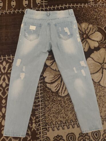 Təzədi demək olar ki cəmi iki üç dəfə geyinilib Açıq mavi rəngdə, “distressed/ripped” dizayna malik cins şalvar. Ön hissədə çoxsaylı dekorativ cırıqlar və ağ rəngdə boyama effekti, arxa hissədə iki klassik cübbə cib mövcuddur. Belində kəmər üçün ilgəklər, fermuar + düymə bağlanması var. Dar/kəsimli paça, gündəlik və streetwear tərzi üçün uyğundur. Yüngül denim parça, həm yaz‑yay mövsümündə, həm də laylı kombinlərdə rahat istifadə edilə bilər. Rəng: açıq denim (ağ solmalarla). Dizayn: ripped, ləkə effektləri ilə. Ciblər: 2 ön, 2 arxa. Bağlanma: düymə və fermuar. Kəmər taxmaq imkanı. Uniseks tərzdə kombinə oluna bilən model.