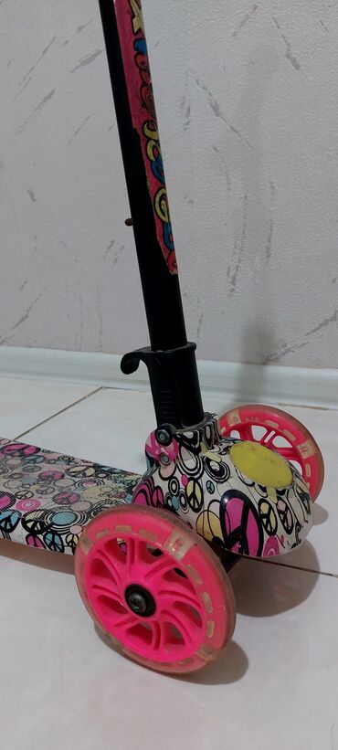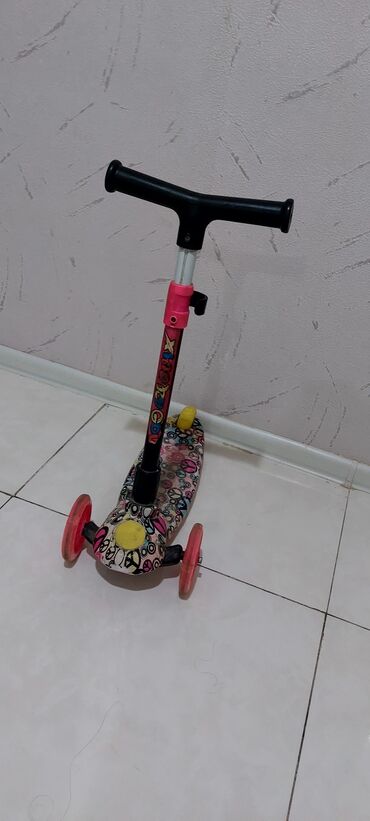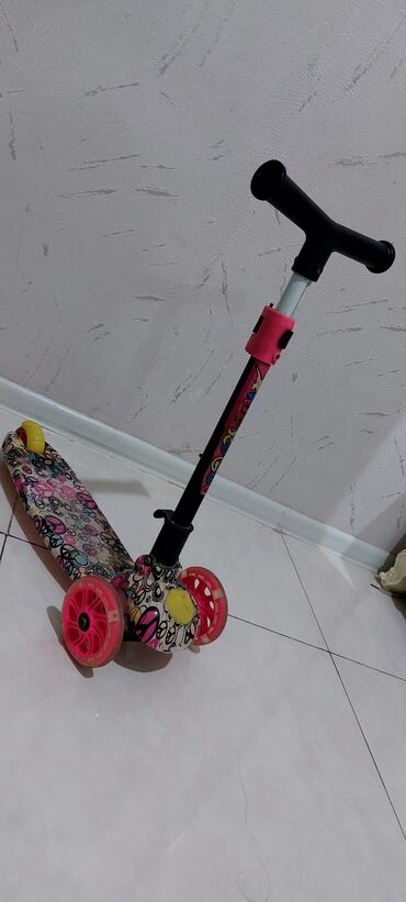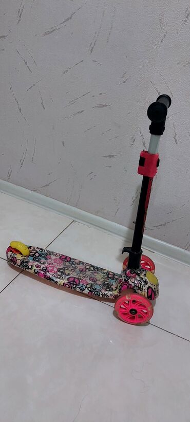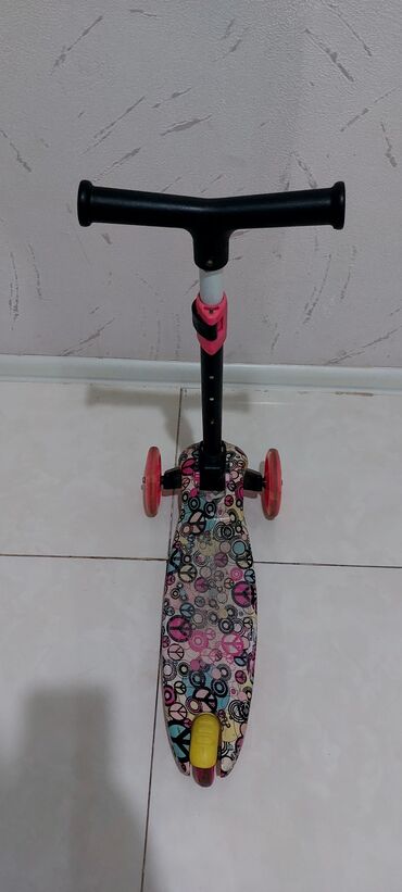 Uşaq üçün skuter və mini skeytbord dəsti - Skuter: 3 təkərli, güllü-çəhrayı rəngdə. Ön hissədə rəngli LED işıqlar, arxa hissədə əlavə iki işıqlandırma modulu. Sürüşərkən sabitlik üçün ön tərəfdə i...