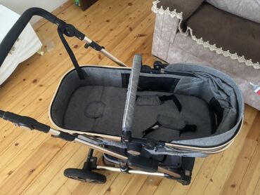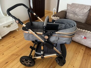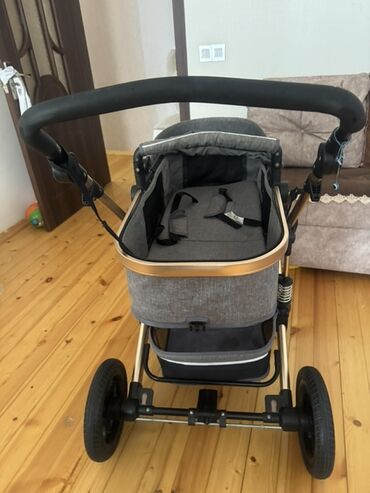 Bu, uşağın rahatlığını təmin etmək üçün nəzərdə tutulmuş çoxfunksiyalı uşaq arabasıdır. Tənzimlənən oturacaq və tutacaq mövcuddur. Arabanın möhkəm qızılı rəngli çərçivəsi və təkərləri var. Təkərlər müxtəlif səthlərdə rahat hərəkət etmək üçün uyğundur. Aşağı hissəsində uşaq əşyaları və ya alış-veriş üçün rahat saxlama səbəti var. Bu uşaq arabası gəzintilər və ya səyahətlər zamanı istifadə üçün əlverişlidir. Uşaq arabasının oturacağı uşağın yaşına uyğun tənzimlənə bilir. Parçası boz rəngdədir. Təkərləri qara rəngdədir. Tutacaq qara rəngdədir. Çərçivə qızılı rəngdədir. Araba yığcam formaya qatlanaraq asanlıqla daşınır və saxlanılır. Oturacaq uşağın rahatlığı üçün genişdir. Beş nöqtəli təhlükəsizlik kəməri uşağın arabada təhlükəsiz qalmasını təmin edir.