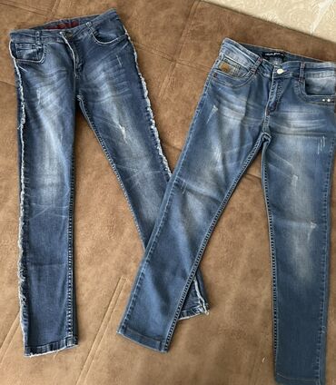 - Cins şalvarlar (2 ədəd): Klassik mavi rəngdə, solğunlaşdırma (wash) effekti və yüngül yırtıq detalları. Beşcibli dizayn: iki ön, bir sikkə cibi, iki arxa cib. Dar kəsimə yaxın, elastik tərkibli material rahatlıq verir. Birində yan tikiş boyunca xırda naxışlı/kənar detal görünür.