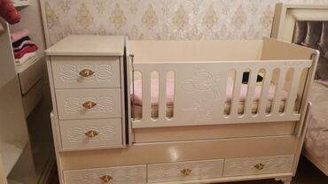 Uşaq beşiyi –2il bunan qabağ 500manat Alinib 100 manata satilir klassik dizaynlı, funksional model - Rəng: ağ, qızılı dekor detalları - Başlıq: yumşaq kapitone süni dəri/yunlu parça başlıq - Ön ...