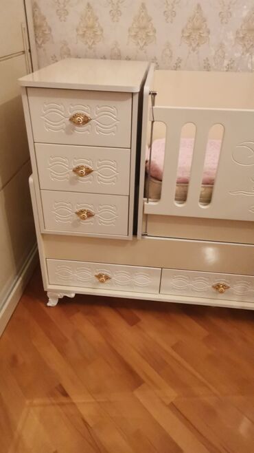 Uşaq beşiyi – Aymını brendi yenidir. eve uygun gəlmədiyi üçün satılır. - Rəng: ağ, klassik dekorativ naxışlı ön panel - Material: MDF/laminat kombinasiyası (vizual olaraq), hamar və asan təmizlənən...