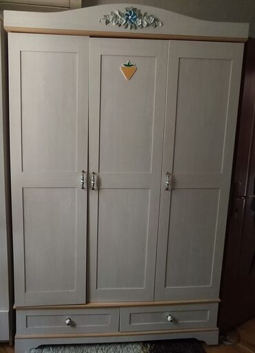 - Üç qapılı paltar şkafı: yuxarı hissədə dekorativ floral işləmə, 3 bölmə, alt hissədə 2 çekmece. Asılqan və rəf yerləşdirməsi üçün geniş daxili həcm.