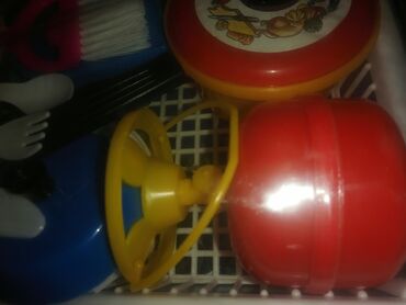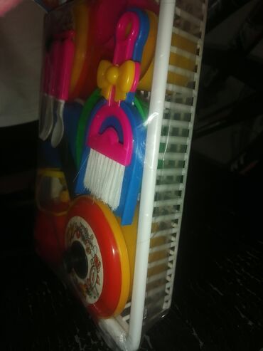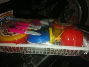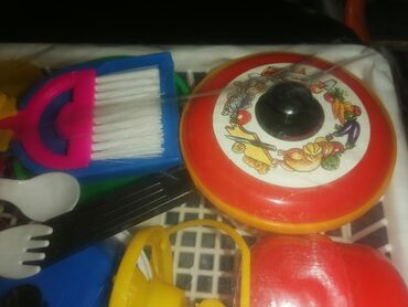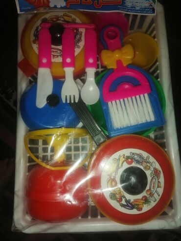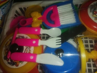 Komplekt: müxtəlif rəngli qazan və tavalı dəstlər, qapaqlar, süzgəc/çəngəl/qaşıq və bıçaq (oyuncaq), yuyucu fırça və xırda mətbəx aksesuarları