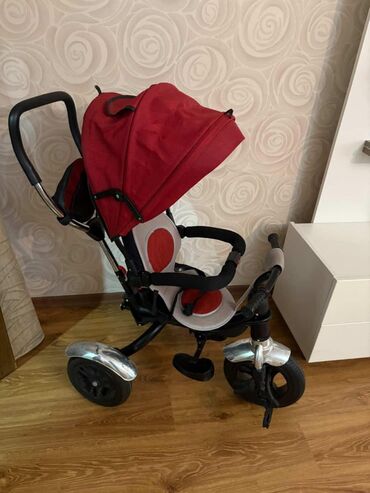 Aygün….Uşaq üçtəkərli velosipedi (valideyn tutacağı ilə) - Rəng: qırmızı-qara, oturacaq və arxa hissə nəfəsalan parça - Valideyn üçün tənzimlənən itələmə tutacağı - Günəşlikli böyük tent (çıxarıla...