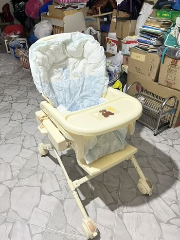 Uşaq yemək stulu - Rəng: krem/açıq sarı tonlarında, üzərində şirin ayıcılı naxış - Tənzimlənən hündürlük və arxalıq: oturacaq və bel hissəsi bir neçə mövqeyə gətirilə bilir - Çıxarılan ikiqat masa...