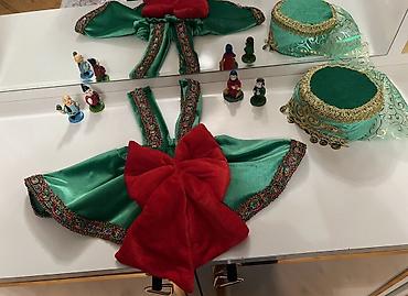 - 1 ədəd yaşıl parlaq parça ilə işlənmiş ətək/sundress, kənarları naxışlı bəzək lentləri və ön hissədə iri qırmızı məxmər bant
