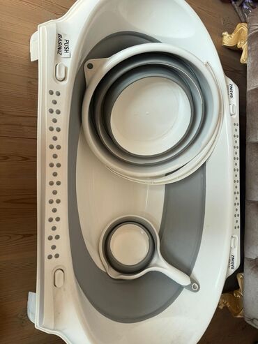 - Dəst tərkibi: ayaqlı qatlanan vanna, 3 ölçüdə qatlanan qab/leyən, tutacaqlı kiçik su qabı.