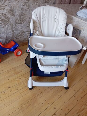 Uşaq yemək stulu - Rəng: ağ və tünd mavi kombinasiya - Yumşaq, rahat oturacaq və bel dayağı - Çıxarıla bilən böyük süfrə: qaba üçün dairəvi yuva var - Ayaqlıq hissəsi - Alt hissədə geniş səbət/sax...