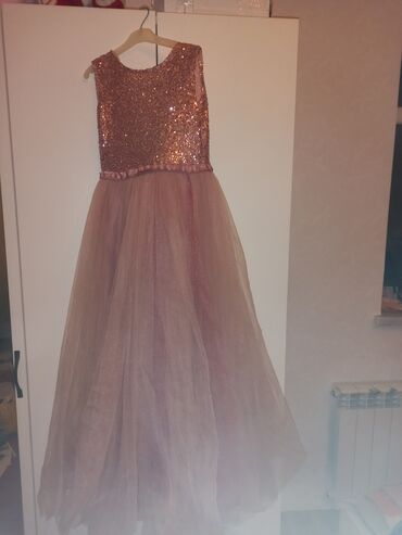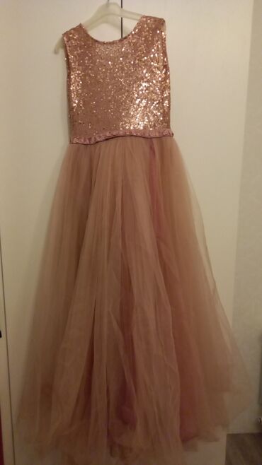 Uşaq üçün ziyafət/gecəlik paltarı is - Rəng: şampan/bej tonlarında - Material: çoxqatlı yumşaq tull (ətək hissə), üst hissədə parlaq payetli parça - Dizayn: şəffaf qolsuz yuxarı hissə, beldə iri p...