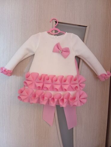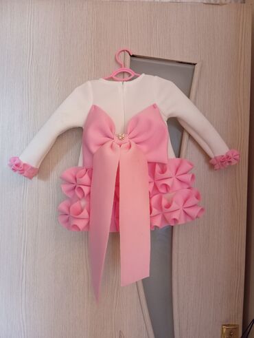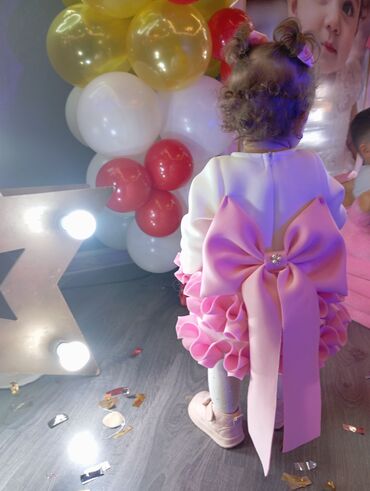 Şəkillərdə paltarın həm ön, həm arxa görünüşü və tədbirdə geyim üzərində görüntüsü göstərilib. Çəhrayı iri bant mərkəzində dekorativ daşlı broşla vurğulanıb, ətək hissəsinin həcmli quruluşu isə fotolarda çox estetik duruş yaradır. Uşağın sərbəst hərəkəti üçün elastikliyə malikdir. Pink asqı daxil deyil.