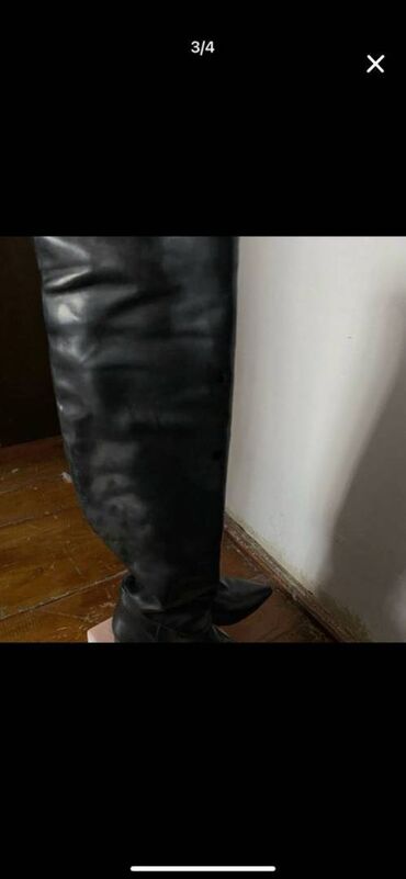 Qadın çəkmələri – qara, dizə yaxın uzunluq BİR AYDIR SİFARİŞ EDİLİB ÖLÇÜ SƏHVDİR DEYƏ SATILIR. - Model: geniş borulu, yüngül büzməli şaft dizayna malik uzun çəkmə - Rəng: parlaq qara - Material: s...