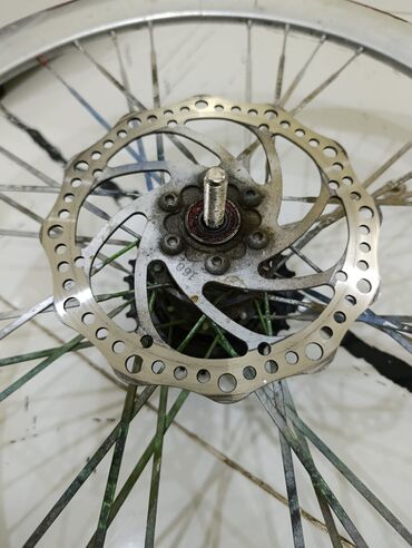 - Ön təkər və rotor: Disk əyləc rotoru 6-bolt montajlı, mərkəzdə rulmanlı hub. Təkər spokları və kaseti görünür, oxu vintli (bolt-on) tipdir.