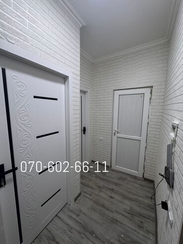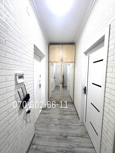 - Səliqəli dəhliz, ağ kərpic teksturalı divarlar, laminat döşəmə
