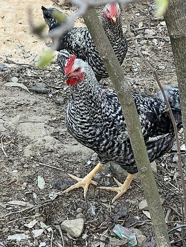 Məhsul: Xoruzlar (8 ədəd) Təsvir: - Şəkildə iki sağlam xoruz görünür: biri qırmızı-qəhvəyi rəngli, digəri qara-ağ naxışlı tüklərə malikdir. - Böyük, açıq qırmızı daraq və sallantıları var. - Güclü...