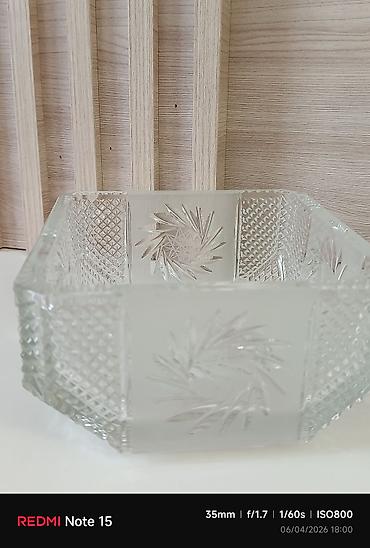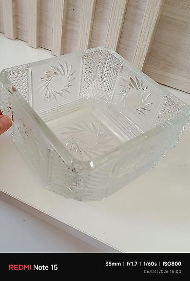 Şüşə qandaldan (meyvə/şirniyyat qabı) - Material: şəffaf şüşə - Dizayn: kəsim formalı naxışlı səth, dalğalı kənarlar - Forma: dairəvi - Ölçü: 22.5 sm diametr (qutu üzərində göstərilib) - Bölmələr:...