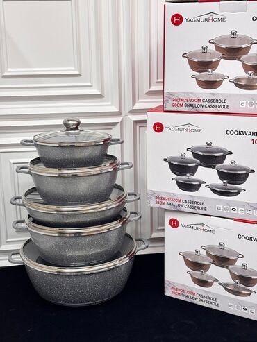 - Ölçülər: 20 / 24 / 28 / 32 sm dərin qazanlar + 28 sm dayaz qazan (cəmi 5 qazan, 5 şüşə qapaq)