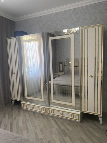 - 5 qapılı dolab: ortası iri güzgülü sürüşmə/qanad qapılar, yanlarda ağ-qızılı zolaqlı qapılar, altda 2 geniş çekmece