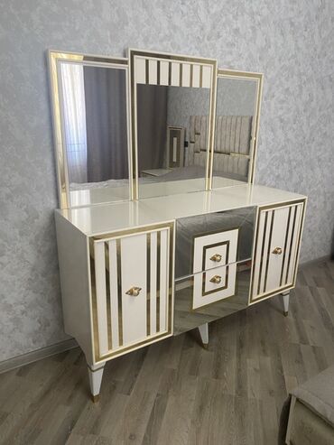 - 3 güzgülü tualet masası (iki yan qapı, mərkəzdə çekmece bölməsi, qızılı haşiyələr və dekorativ zolaqlar)