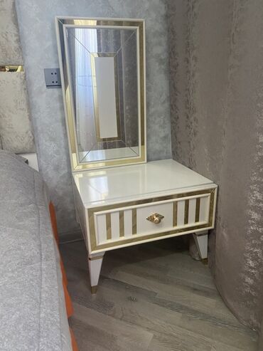 - 2 ədəd tumba (hərəsinin 1 çekmecesi, üstündə dekorativ güzgü paneli), ağ-qızılı dekor, relyefli ayaqlar