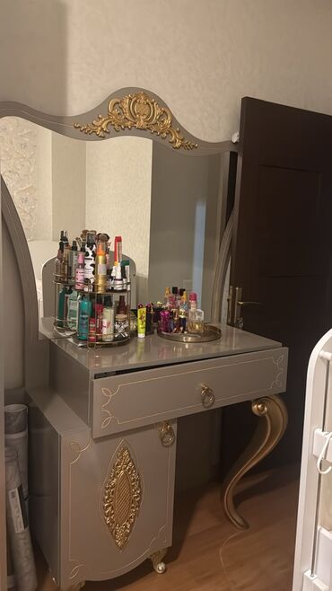 - Makiyaj masası: böyük dekorlu güzgü; üstdə geniş səth; 1 iri çekmece; yan dolab və qapılı bölmə; qızılı dekorativ ayaqlar və tutacaqlar.