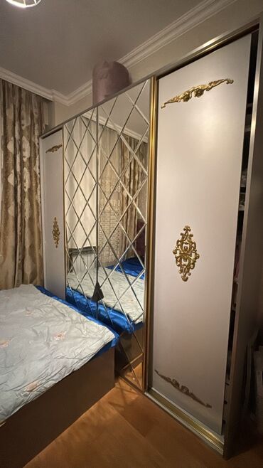 Yataq otağı mebelləri dəsti Tərkibi: - Geniş şkaf-kupe: 3 qapılı, tam ön güzgülü sürgülü sistem. Yuxarıda əlavə saxlama bölməsi. Taxta dekorlu, metal relslər. - Yataq: ikinəfərlik ölçü, taxta kark...